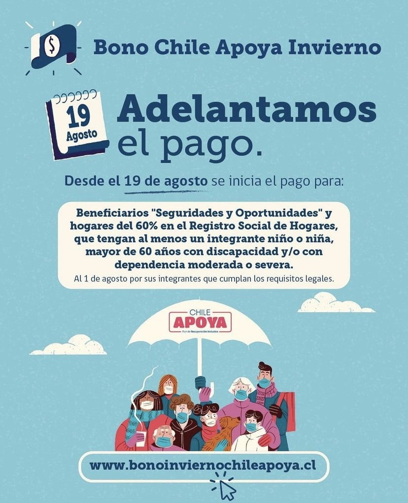 Las primeras personas beneficiadas podrán conocer su lugar y fecha de pago desde el 5 de agosto con su RUT y fecha de nacimiento a través del sitio web: https://www.bonoinviernochileapoya.cl