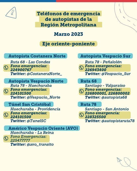 • Santiago – Valparaíso. Fono emergencias: 226800001, 226800002, Twitter: @autopista68