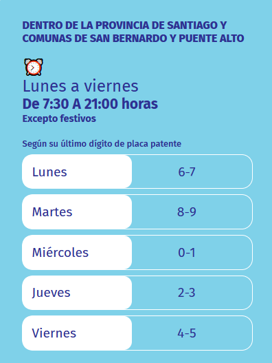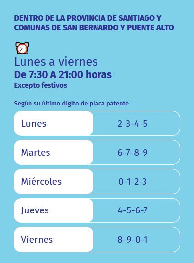 El siguiente calendario de restricción vehicular 2023 rige para toda la provincia de Santiago, además de las comunas de San Bernardo y Puente Alto.